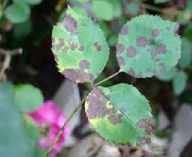 該病為害月季、薔薇、黃刺玫、玫瑰、白玉堂等近百種薔薇屬植物及其雜交種。主要為害葉片,感病初期葉片上出現(xiàn)褐色小點(diǎn),以后逐漸擴(kuò)大,邊緣呈不規(guī)則的放射狀,病部周圍組織變黃,病斑上生有黑色小點(diǎn),即病菌的分生孢子盤,嚴(yán)重時(shí)病斑連片,甚至整株葉片全部脫落,成為光桿。嫩枝上的病斑為長(zhǎng)橢圓形、暗紫紅色、稍下陷。