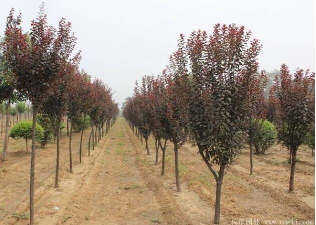 紫葉李,是落葉的喬木或是落葉的常綠灌木,樹體高度1.5~4.5米不等,規格米徑小一點的有2cm3cm4cm5cm6cm7cm粗的有直徑8cm10cm12cm15cm等,也是有叢生紫葉李,冠幅規格2~4.5米,紫葉李葉子色調是深綠色,橢圓形,新芽早春3月長出,深秋霜降落葉。品種不相同,樹葉,花朵,枝條也是有點細小的不同,紫葉李花朵色調是有淺紅等。紫葉李